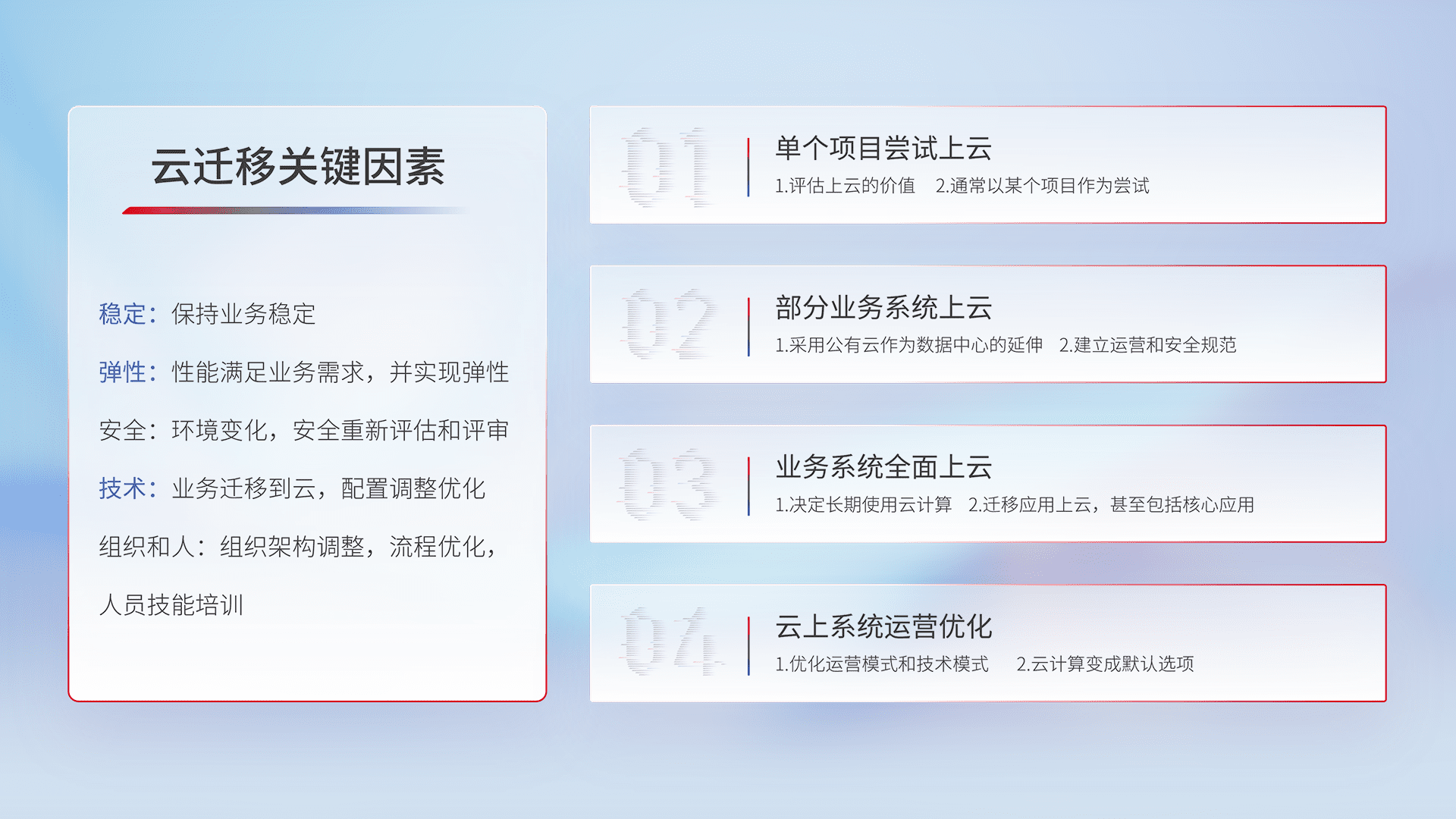 结合实际业务,,,,从规划设计、、、、云平台选型、、云原生改造、、、、数据迁移、、、集成交付,,,迁移全过程为客户识别最佳上云路径,,,,做好风险识别管理,,,,设计网络架构、、、、身份权限、、、、安全审计合规、、操作审计、、、、日志审计、、、、监控告警策略、、、多站点容灾设计等,,对云上基础设施进行整体规划,,,提升IT治理水平,,,,以满足弹性、、、高可用、、、高性能的需求。。