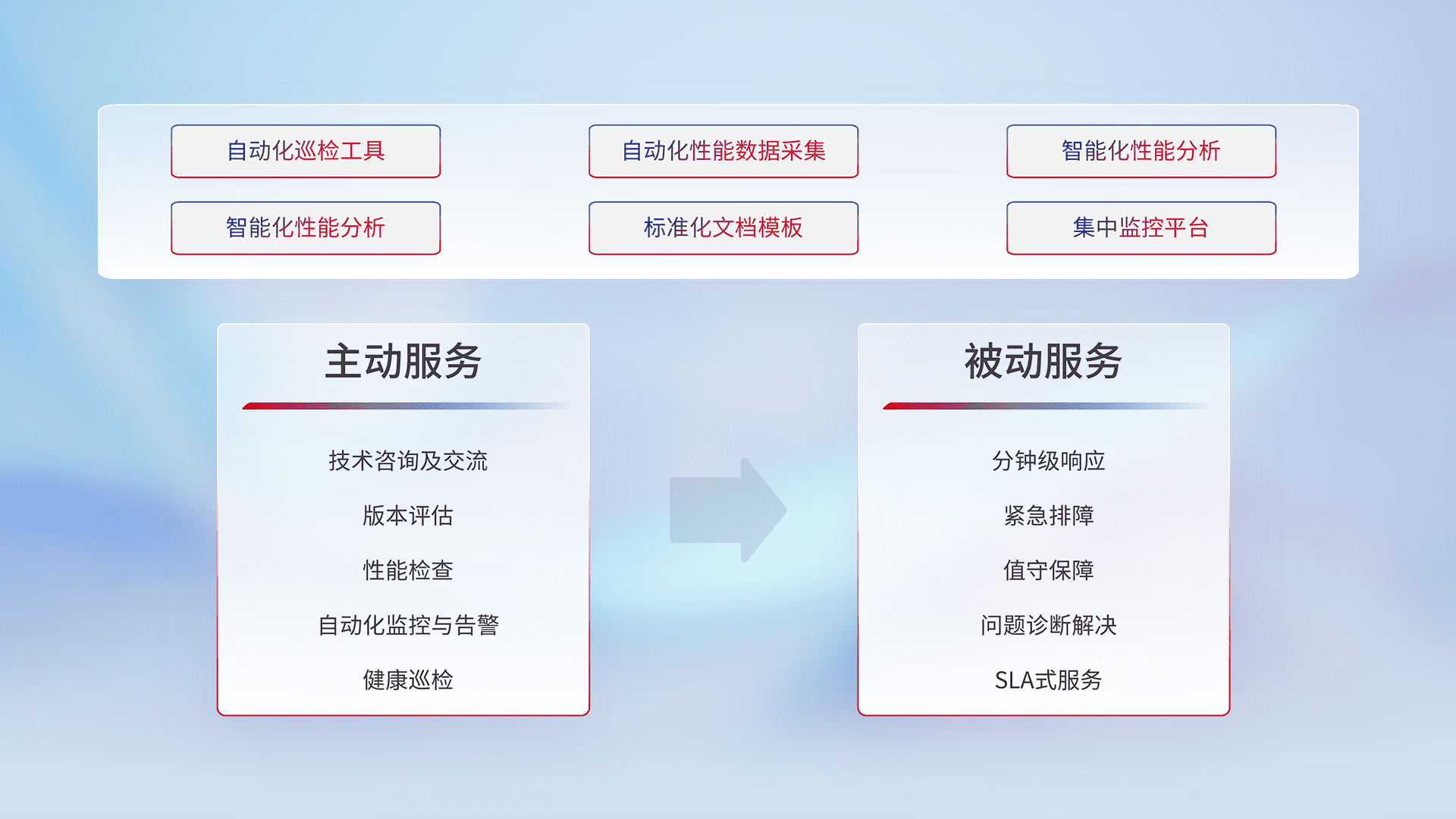 智能化工具和标准化文档,,保障服务质量,,提供主动服务(包含技术咨询、、、版本评估、、性能检查、、、、自动化监控与告警、、、健康巡检)和被动服务包含(分钟级响应、、、紧急排障、、值守保障、、、问题诊断解决、、SLA服务)。。。。